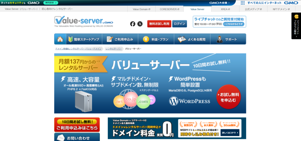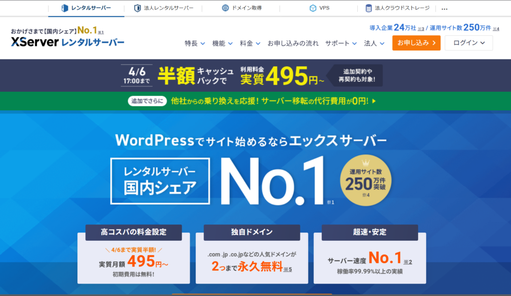 初心者に最も無難にすすめやすいのは、やはりエックスサーバーです。理由は、総合力の高さにあります。公式サイトではスタンダードプランが月額990円〜、初期費用0円、独自ドメイン永久無料特典ありと案内されており、WordPress運営の導線も整っています。また、WordPressクイックスタートの案内があるため、サーバー契約からブログ開設までの流れがわかりやすいのも強みです。総合力と始めやすさを重視する初心者には、最初の候補として考えやすいサービスです。