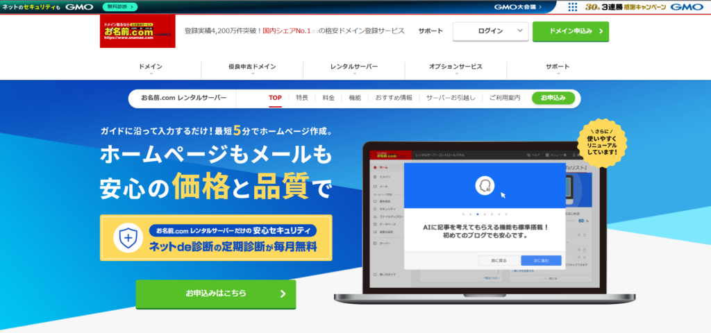 | おすすめ2位低コスト お名前.comレンタルサーバー |