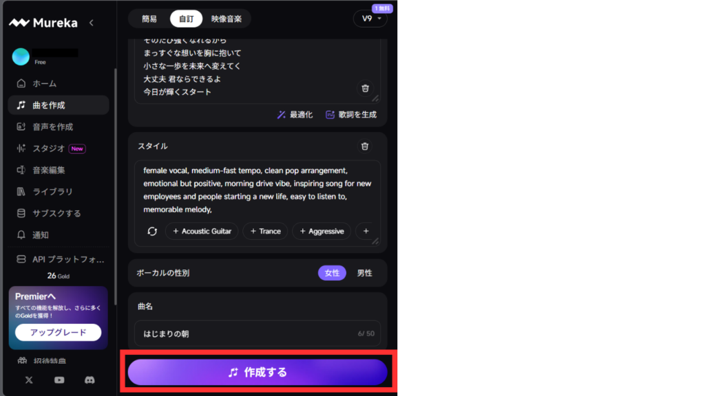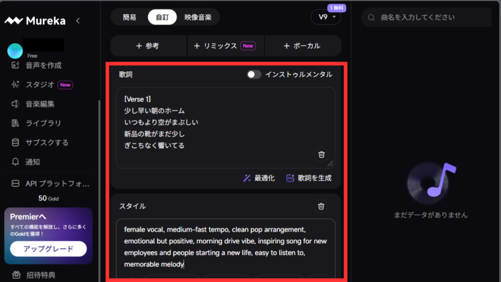 歌詞、スタイル、ボーカルの性別、曲名を入力できる欄があります。